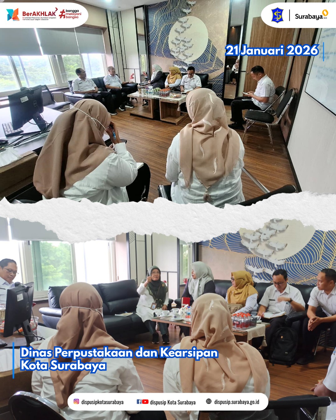 Dinas Perpustakaan dan Kearsipan (Dispusip) Kota Surabaya menerima kunjungan kerja sekaligus studi banding dari Dinas Perpustakaan dan Kearsipan Kabupaten Mojokerto pada Rabu (21/1/2026).